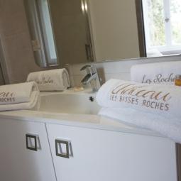 Les Roches: chambre familiale de 19m2 pour 2 adultes et 2 enfants, décoration cocooning en rez-de-chaussée, salle de bain privative avec douche.