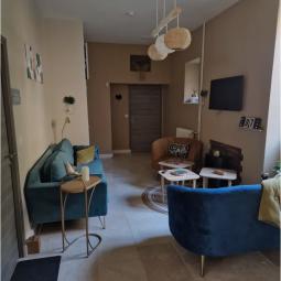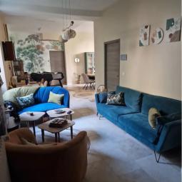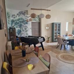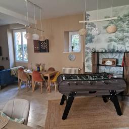Une vue d'une partie de la pièce de vie de 54 m², avec son Baby Foot et son jeu de fléchettes pour des moments conviviaux.