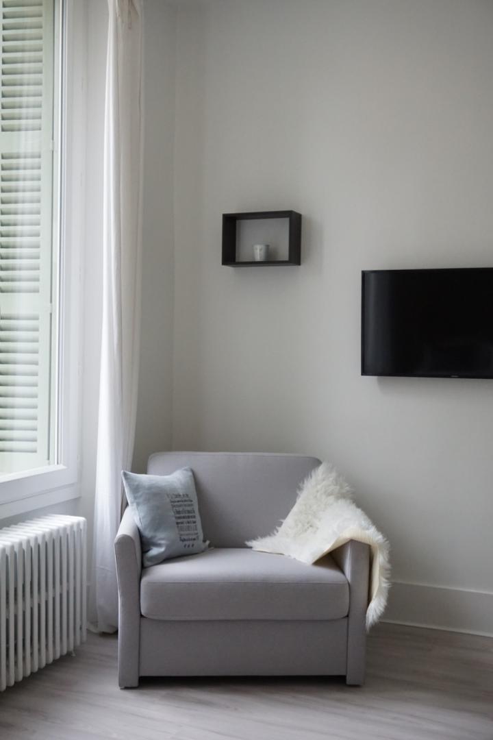La Ligérienne : chambre triple de 19 m2, au 1er étage, décoration style scandinave, salle de bain privative avec douche.