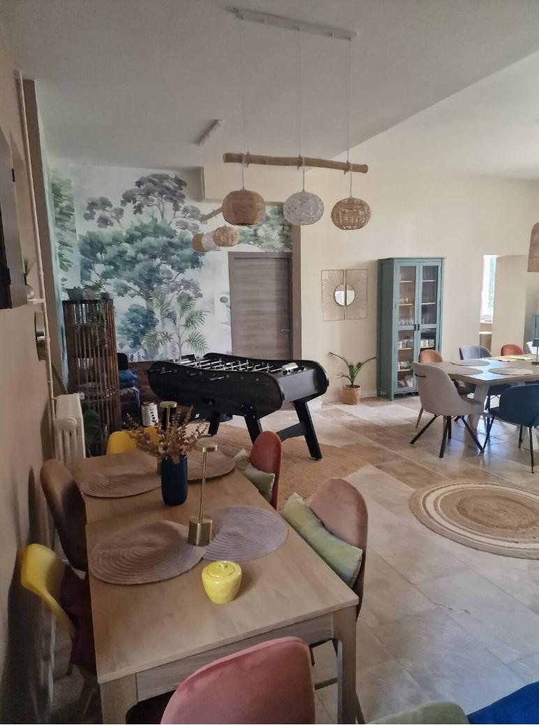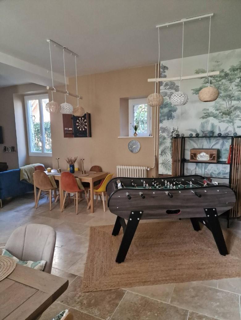Une vue d'une partie de la pièce de vie de 54 m², avec son Baby Foot et son jeu de fléchettes pour des moments conviviaux.